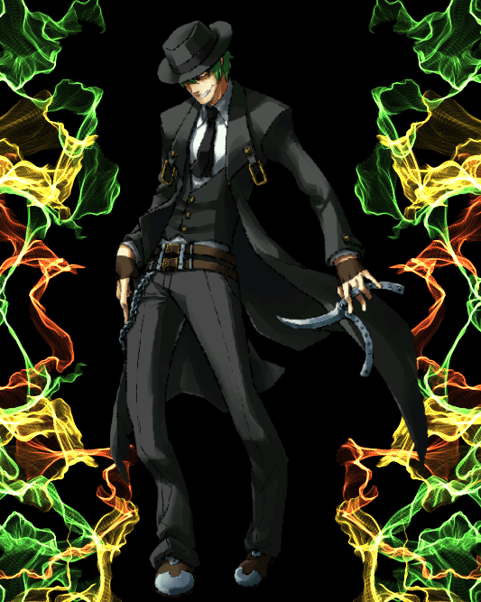 Je vysoký se štíhlou postavou. Bledý, ostře řezaný obličej lemují tmavé zelené vlasy, na kterých nosí klobouk.